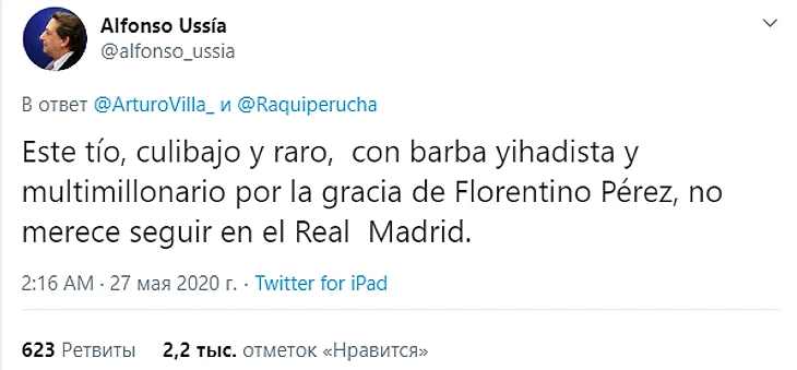 А затем и вовсе перешел на оскорбления: «Этот маленький, странный парень с бородой джихадиста, ставший мультимиллионером по милости Флорентино Переса, не заслуживает оставаться в «Реале».