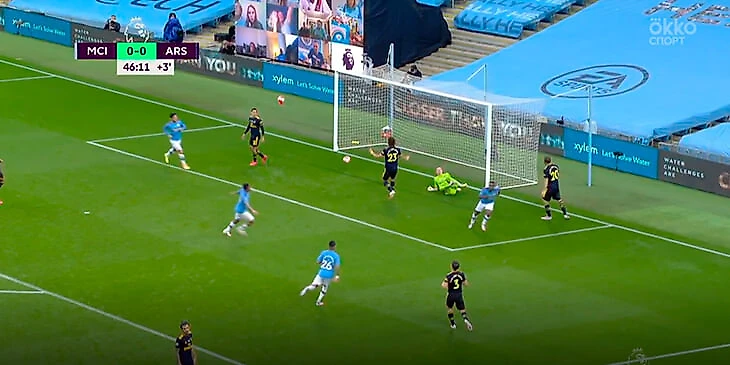 Кевин Де Брюйне тут же нагрузил зону Луиза: сначала вывел Мареза на угол вратарской (спас Лено), потом Стерлинга (промазал). И на 45-й минуте КДБ сместился на фланг и исполнил фирменный кросс в штрафную.
