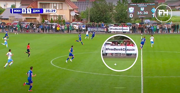 Баннеры – отдельная история. Рядом с баннером «Минайцы» появилось неожиданное полотно с хэштегом #FreeDerekChauvin («Освободите Дерека Шовена»). Точно неизвестно, кто его вывесил, но оно спокойно висело практически по центру и весь матч попадало в кадр телетрансляции.
