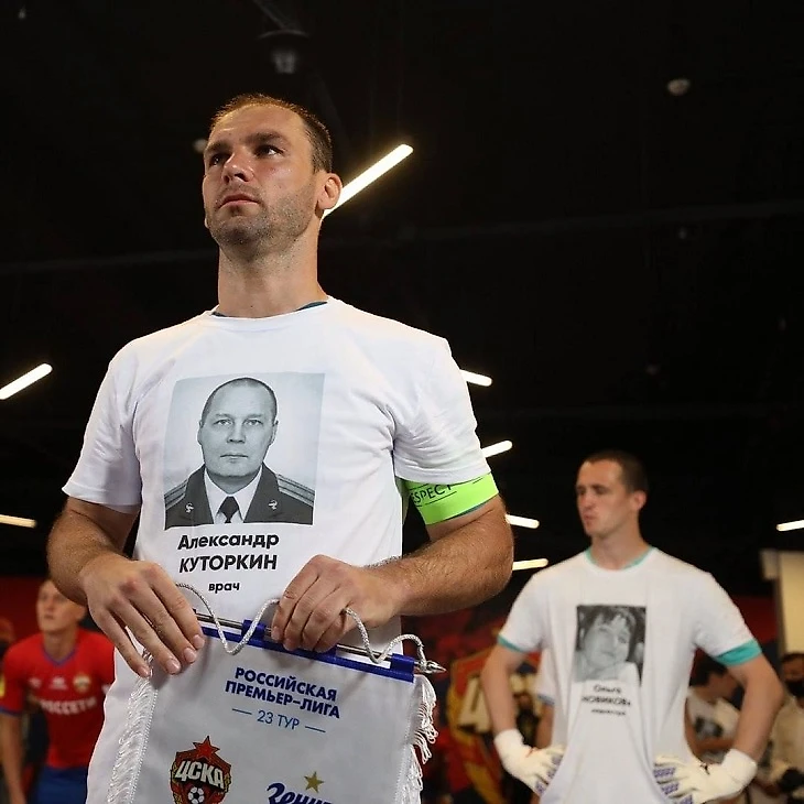 Каждый матч 23-го тура РПЛ приостанавливается на 20-й минуте, и команды аплодируют врачам. Но «Зенит» пошел дальше: на игру с ЦСКА футболисты вышли в футболках с фотографиями и именами врачей. К сожалению, все они погибли, болея COVID-19.