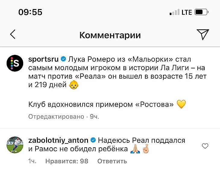 О вчерашнем достижении Луки Sports.ru рассказал в инстаграме – и напомнил о ребятах «Ростова», неделю назад бившихся с «Сочи». В комментарии пришел автор дубля Антон Заболотный. «Надеюсь, «Реал» поддался, и Рамос не обидел ребенка». Серхио во втором тайме красиво положил со штрафного и приговорил «Мальорку».