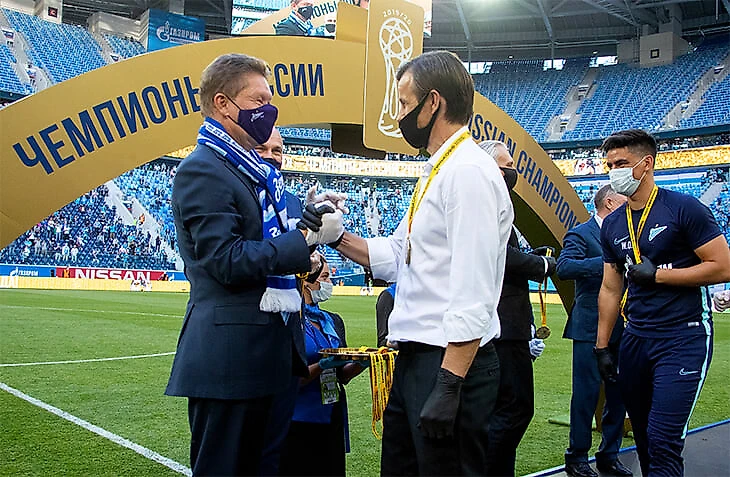 На лице босса клуба Алексея Миллера маска, но она не способна скрыть счастья.