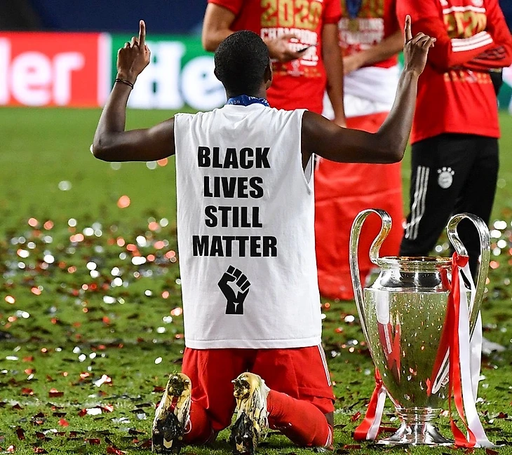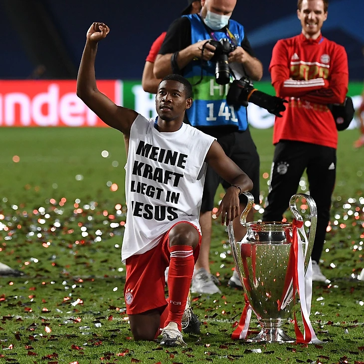 Давид Алаба встал на колени и посвятил победу борьбе с расизмом. Сзади на футболке написано «Жизнь темнокожих все еще имеют значение».