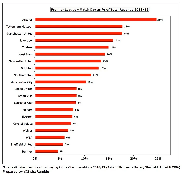 • В сезоне-2018/19 средний доход от матчдея больше всех был у «МЮ» – 4,3 миллиона фунтов. У «Арсенала» и «Ливерпуля» – по 3,2 млн, в топ-6 также «Тоттенхэм» (3 млн), «Челси» (2,1 млн) и «Манчестер Сити» (2 млн). Меньше всех зарабатывал «Бернли» (0,3 млн фунтов) и клубы, тогда выступавшие в чемпионшипе.