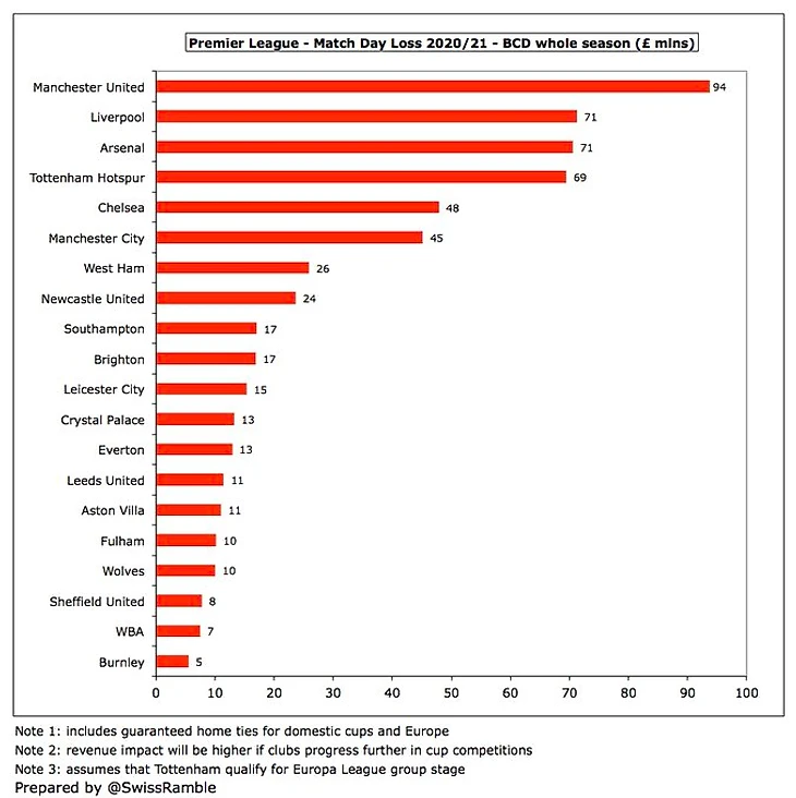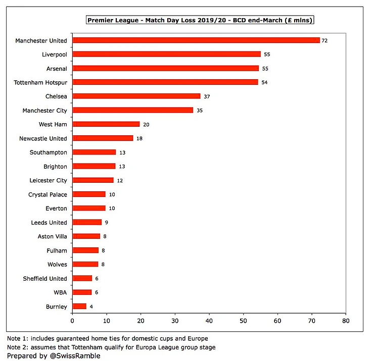Экономический блогер Киран О’Коннор, который ведет твиттер Swiss Ramble, проанализировал потенциальные потери клубов из-за отсутствия матчдея в трех вариантах – до декабря, до марта и до конца сезона. Пожалуй, первый – самый малореальный (ну и минимальный по потерям, соответственно). Поэтому вряд ли имеет смысл останавливаться на нем.