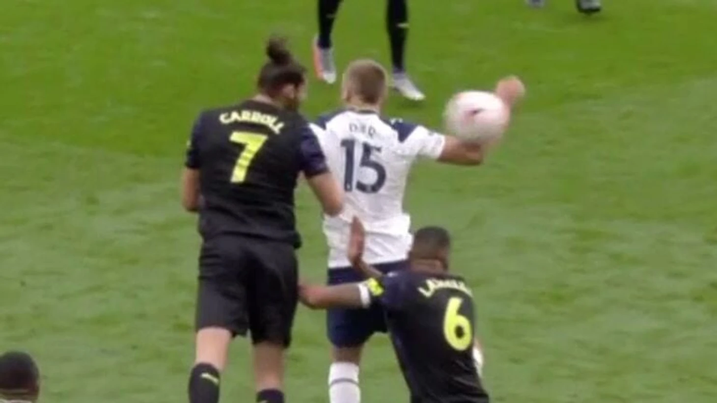 Форвард «Ньюкасла» Энди Кэролл сыграл головой после заброса в штрафную, после чего мяч попал в руку защитника «Тоттенхэма». Дайер при этом находился спиной к мячу и ничего не подозревал.
