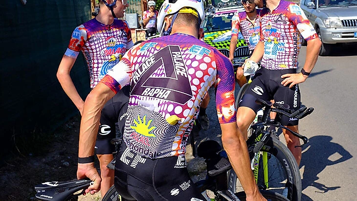 Дизайн новой формы для EF Pro Cycling (и линейку повседневной одежды с тем же дизайном) разработали два британских бренда – Palace и Rapha.