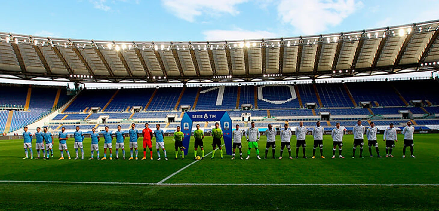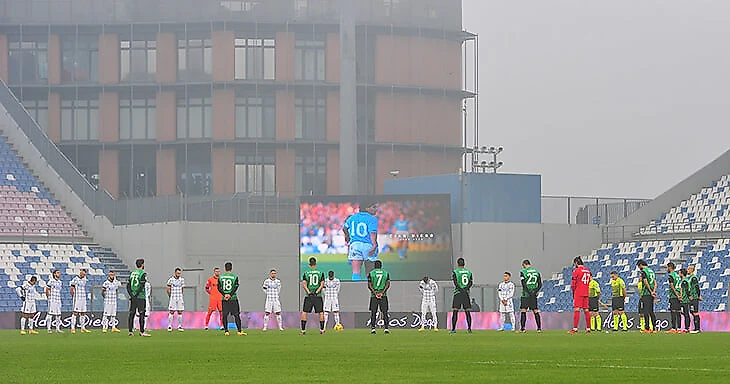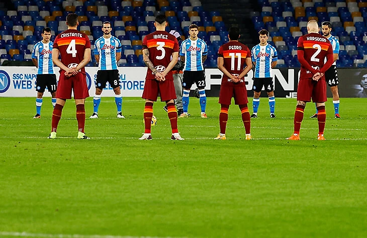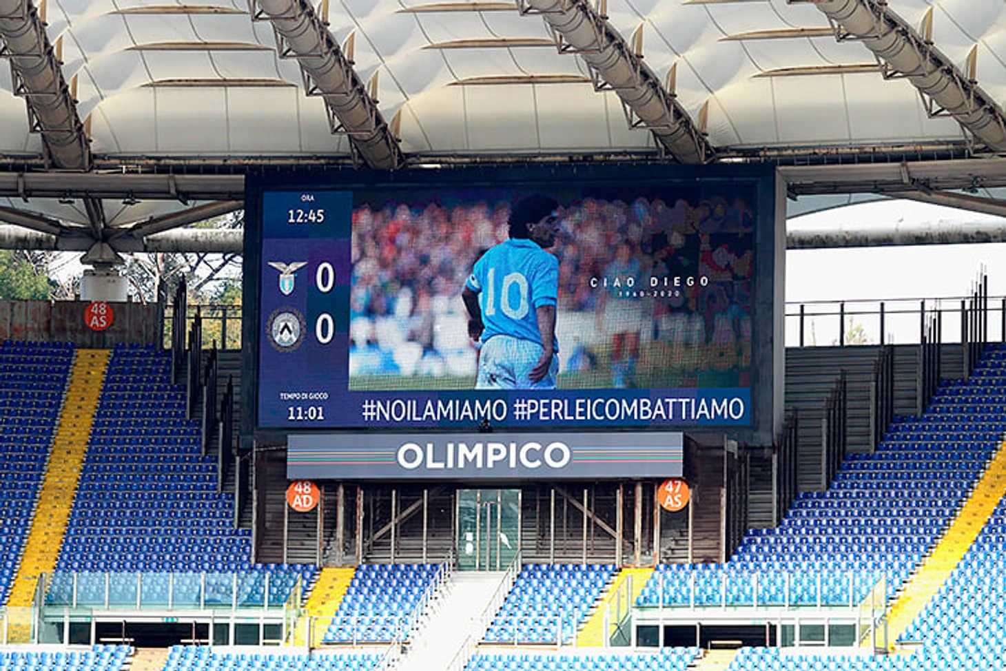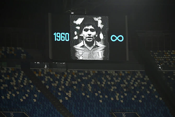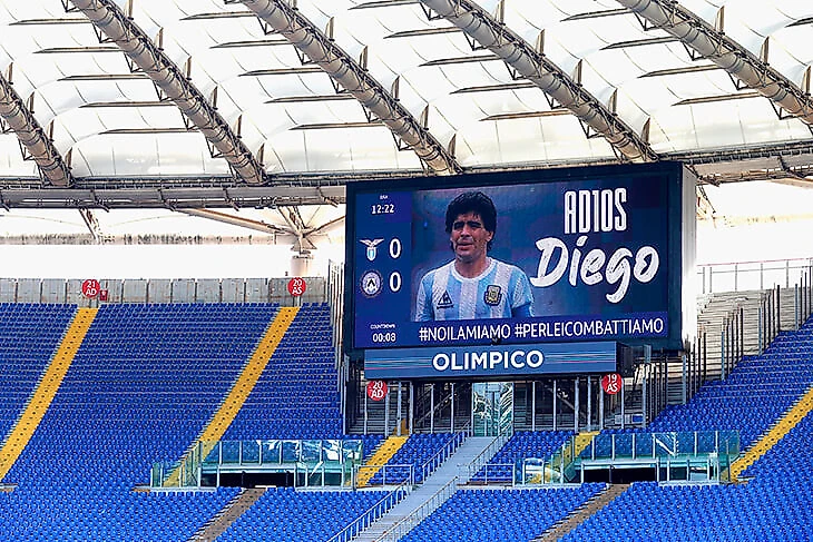 • На поле все выходят с траурными повязками. Перед игрой – минута молчания, в это время на табло фото Марадоны, а на пустых трибунах визуализируют виртуальную надпись Ciao Diego.