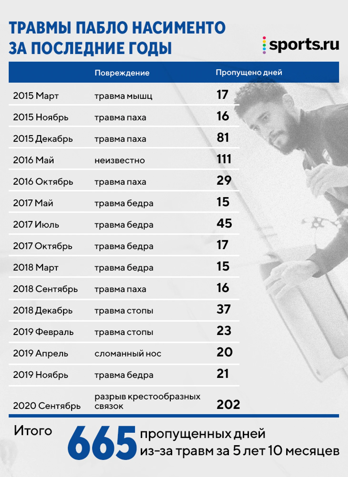 Эта травма – далеко не первая в карьере защитника. Согласно сайту efias.com, специализирующемуся на травмах, с марта 2015 года Пабло 20 раз оказывался в списке травмированных игроков на разные сроки – от 1 дня из-за болезни до 202 дней как раз из-за крестов. Всего за 6 лет защитник пропустил из-за травм 665 дней.