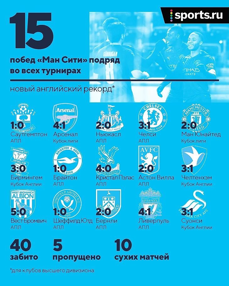 Победив в воскресенье «Ливерпуль», «Манчестер Сити» Пепа Гвардиолы сравнялся с двумя командами-рекордсменами по количеству побед подряд (14 во всех турнирах) – «Престоном» сезона-1891/92 и «Арсеналом»-1987/88. Между «Сити» и очередным достижением стоял только кубковый матч против «Суонси».