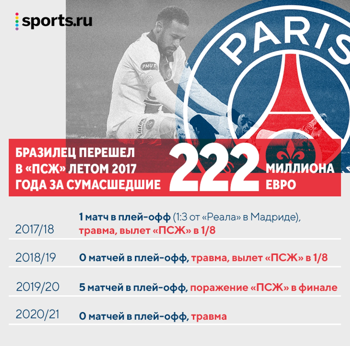 Давайте пройдемся чуть подробнее. В самом первом сезоне во Франции Неймар сломал пятую плюсневую кость (мы подробно рассказывали про эту травму – она мучает бразильца большую часть его карьеры). С февраля и до чемпионата мира он в итоге больше не играл. Впрочем, и на ЧМ у него были проблемы. А «ПСЖ», проиграв первый матч в Мадриде, без Неймара уступил и дома.