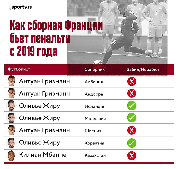 Сборная Франции последние пару лет ужасно бьет пенальти. Только вдумайтесь: с 2019 года из 7 пенальти реализованы только 3 – все от Оливье Жиру. А вот Гризманн и теперь Мбаппе – не забили ни разу.