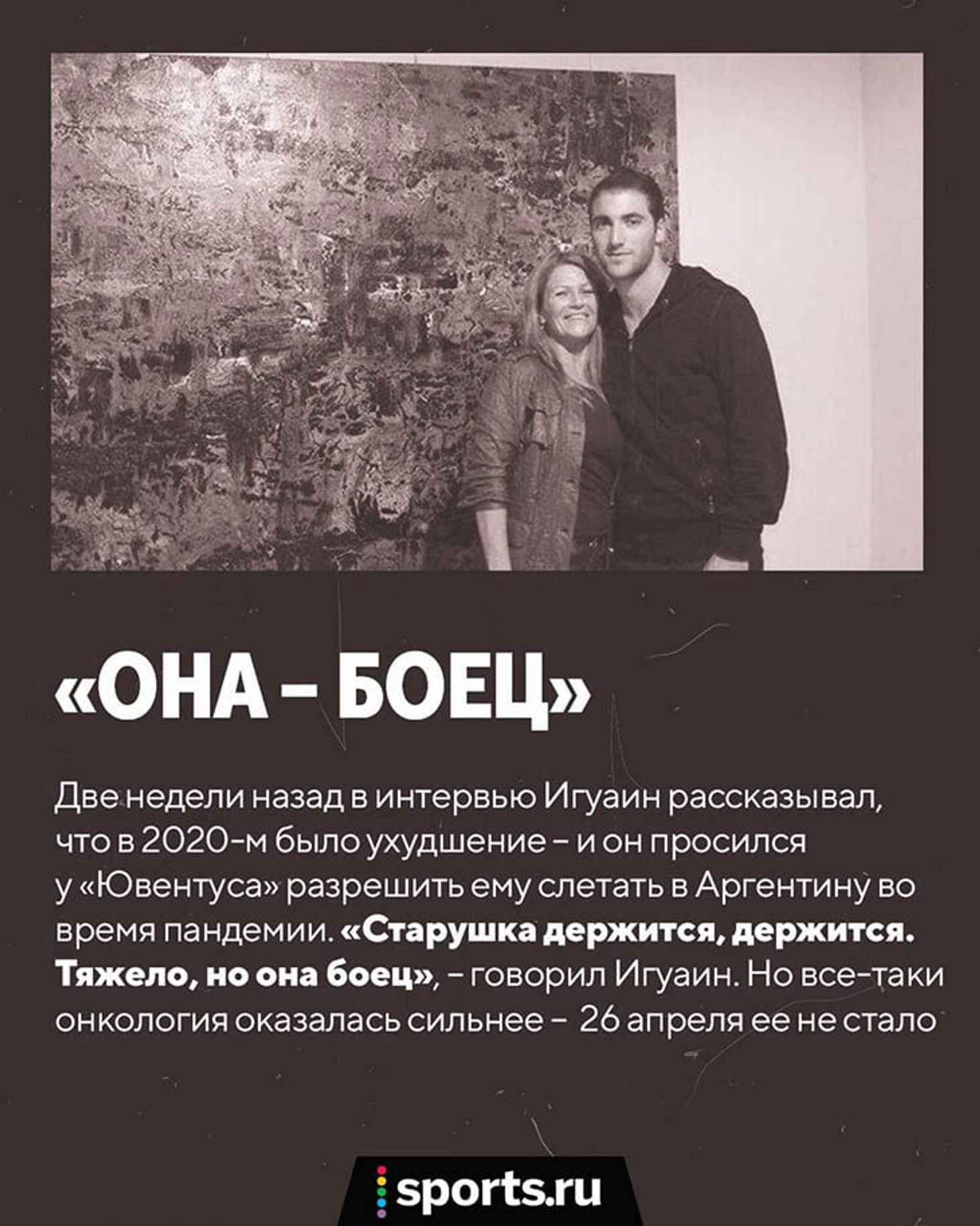 Две недели назад в интервью он рассказывал, что в 2020-м было ухудшение – и он попросил у «Ювентуса» разрешения слетать в Аргентину во время пандемии. «Старушка держится, держится. Тяжело, но она боец», – говорил Игуаин. Но все-таки онкология оказалась сильнее – и 26 апреля она скончалась.