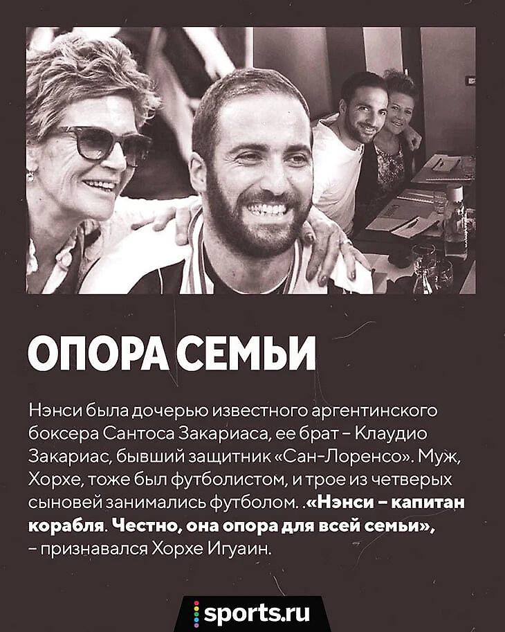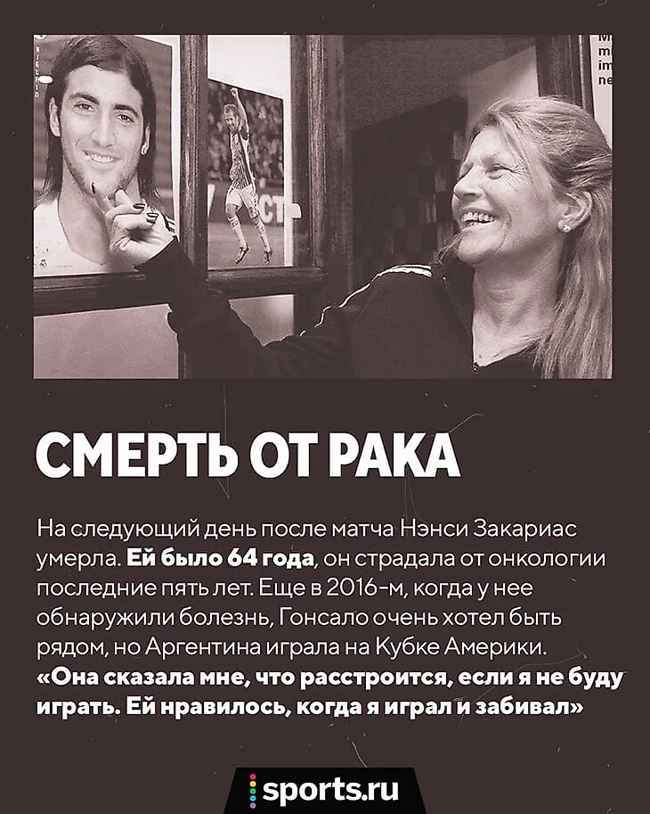 А на следующий день после матча Нэнси Закариас умерла. Ей было 64 года, он страдала от онкологии последние пять лет. Еще в 2016-м, когда у нее обнаружили болезнь, Гонсало очень хотел быть рядом, но Аргентина играла на Кубке Америки. «Она сказала мне, что расстроится, если я не буду играть. Ей нравилось, когда я играл и забивал», – признавался Гонсало.
