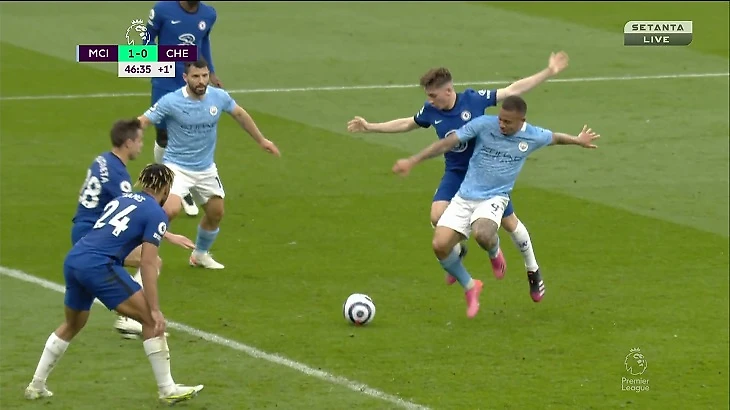 В конце первого тайма «Сити» заработал пенальти. Ферран Торрес прострелил на аргентинца, но тот не смог обработать. Мяч отскочил от Агуэро к Жезусу, в которого сзади врезался Гилмор.
