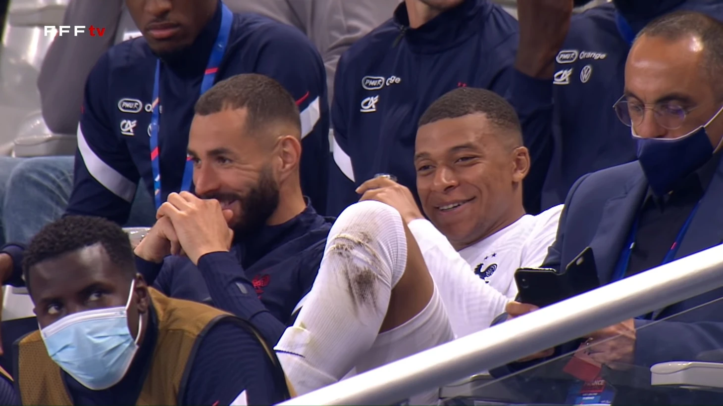 После третьего гола сборной Франции камера выхватила улыбающихся Мбаппе и Бензема на трибуне.