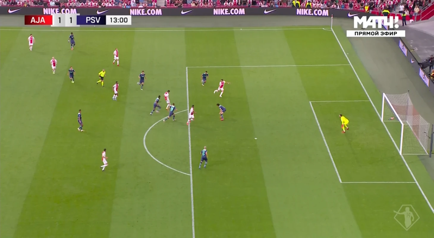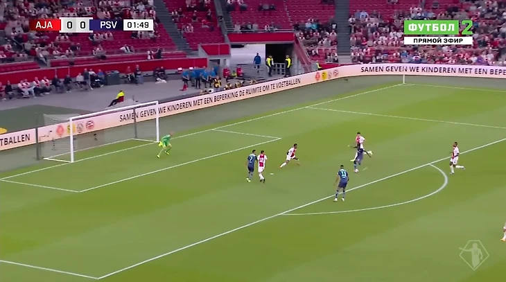 Счет в матче ПСВ открыл уже на второй минуте: 19-летний Нони Мадуэке сместился с правого фланга в центр и катнул в ближний угол ворот 37-летнего Ремко Пасвера.