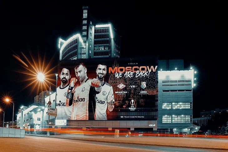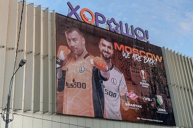 В среду «Спартак» стартует в Лиге Европы – домашним матчем с «Легией». Поляки уже прилетели в Москву и напомнили о себе: закупили рекламу на фасаде нескольких торговых центров, вывесив там баннеры с анонсом игры.