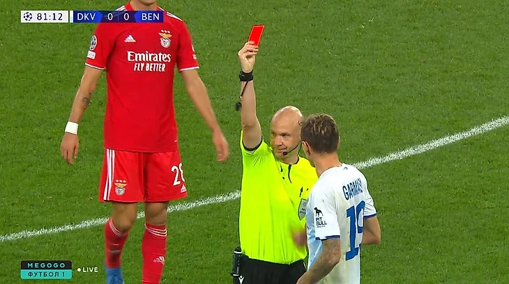 Матч между киевским «Динамо» и «Бенфикой» закончился без голов, зато подарил забавный судейский сюжет. За 10 минут до конца встречи британский арбитр Энтони Тэйлор чуть не удалил с поля Дениса Гармаша.