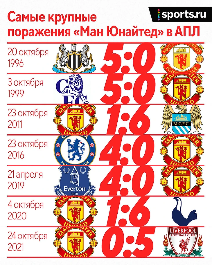 Крупнейшие поражения «МЮ» в АПЛ: получали по 6 от «Сити» и «Тоттенхэма», а 0:5 до «Ливерпуля» было дважды