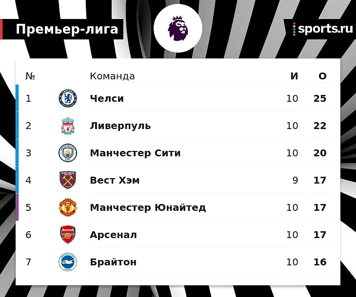 Таблица сейчас выглядит вот так. «Вест Хэм» в воскресенье может догнать «Ман Сити» (если победит «Астон Виллу»), а «Челси» потихоньку уходит в отрыв – уже +3 от второго места. Но пока только конец октября – самое интересное еще впереди.