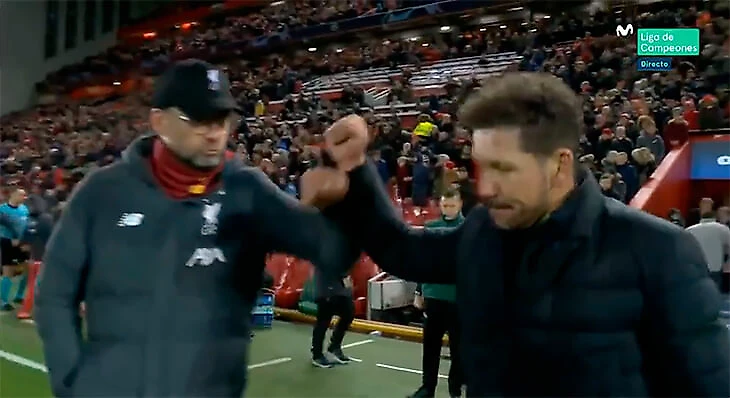 А вот кадр после вырванной «Атлетико» игры на «Энфилде»: еще более довольный Симеоне отбивает кулачок мрачному Юргену.
