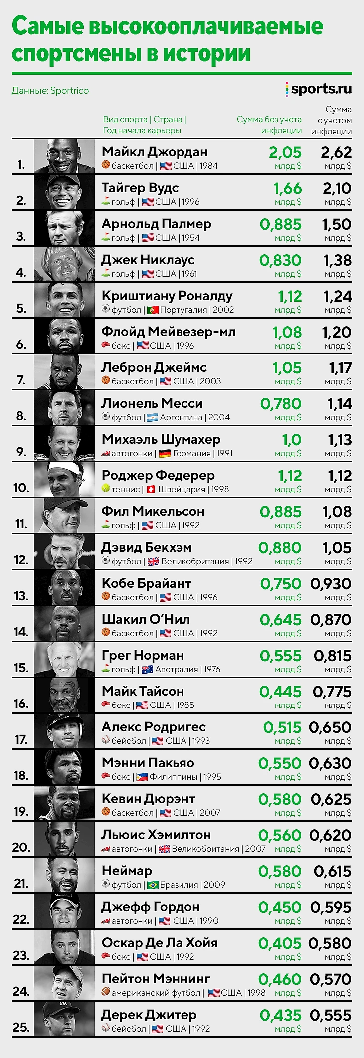 • В топ-25 вошли атлеты из восьми видов спорта, их совокупный доход составил 25,5 млрд долларов.