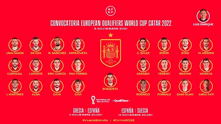 В пятницу Луис Энрике объявил заявку сборной Испании на финальные матчи отбора ЧМ-2022. Там нужны все сильнейшие, потому что полуфиналисты Евро-2020 до сих пор не обеспечили себе путевку в Катар. 14 ноября состоится ключевая игра против шведов, которые пока идут в лидерах, отрыв – 2 очка.