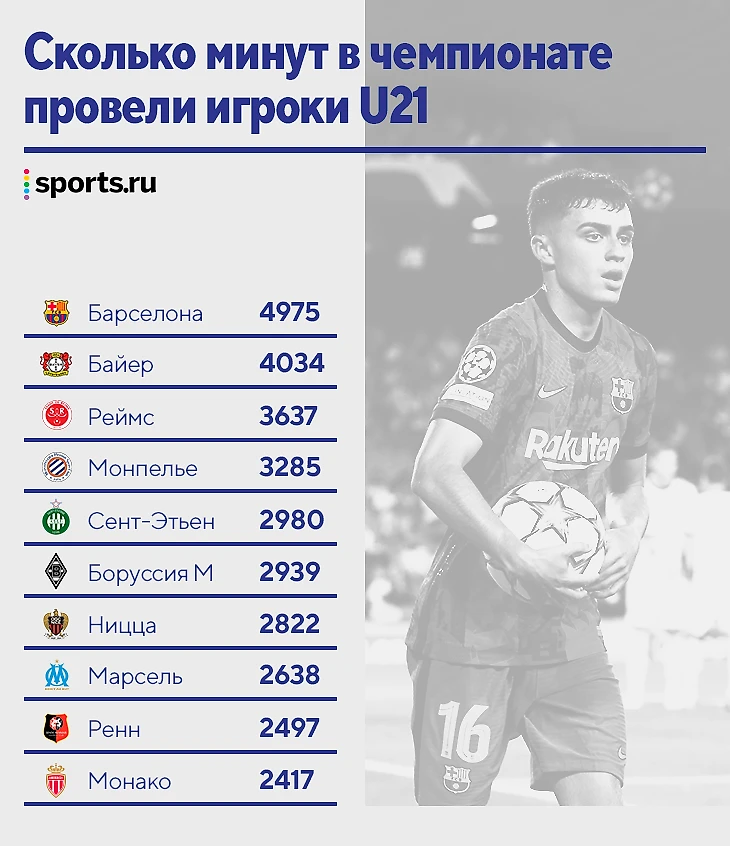 • «Барселона» – явный лидер, отрыв даже от второго места гигантский (почти тысяча минут). В Ла Лиге сыграли 10 человек (Деста считали до того, как ему исполнился 21 год). Чемпионат по минутам – Эрик Гарсия (21 исполнится только в январе), по матчам – Гави (16 матчей, больше во всем клубе только у Бускетса), Нико Гонсалес играет почти столько же, сколько Френки де Йонг и Мемфис Депай (15 матчей).