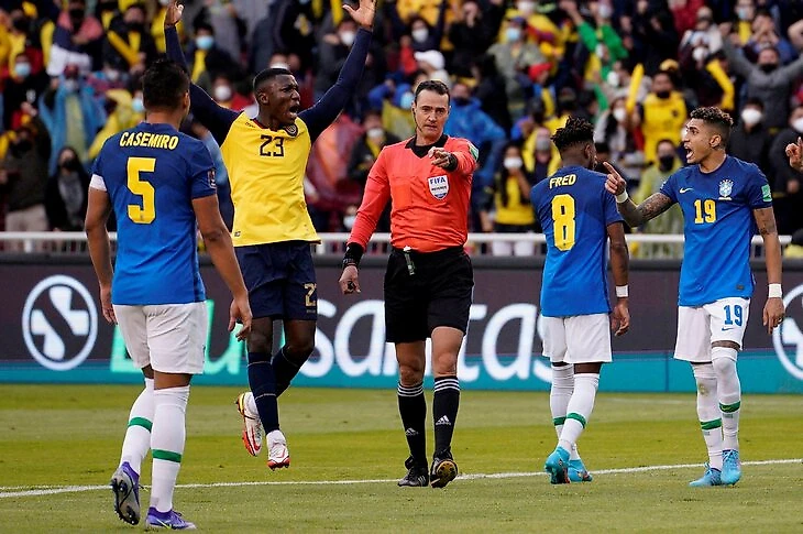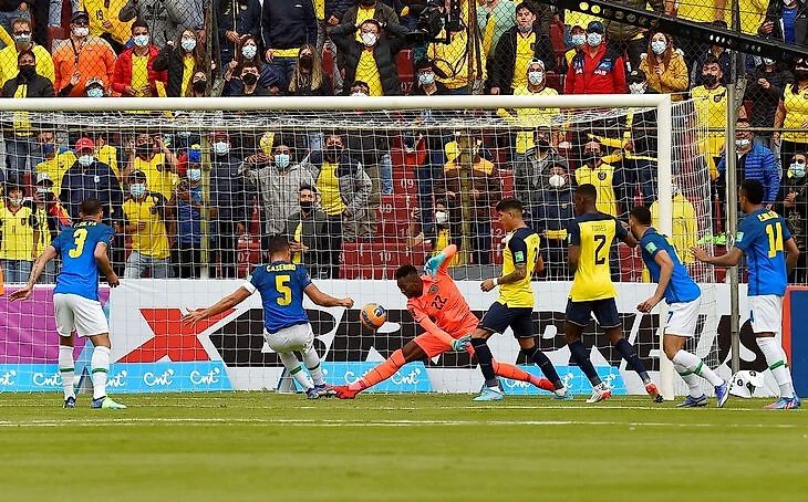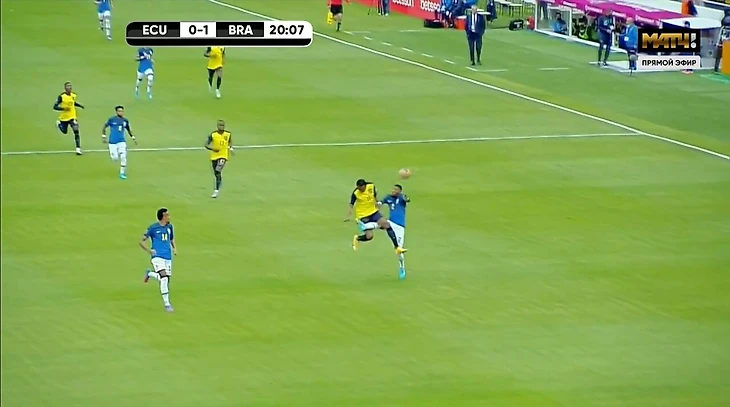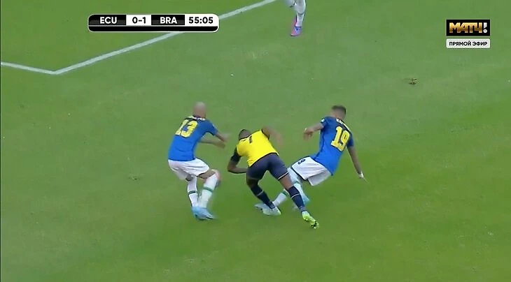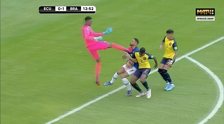На 13-й минуте бразилец Матеус Кунья выскакивал один на один, но нарвался на шипы вратаря эквадорцев Александера Домингеса – прямо в шею. Кипера удалили с помощью ВАР – странно только, что не сразу. За такое-то.