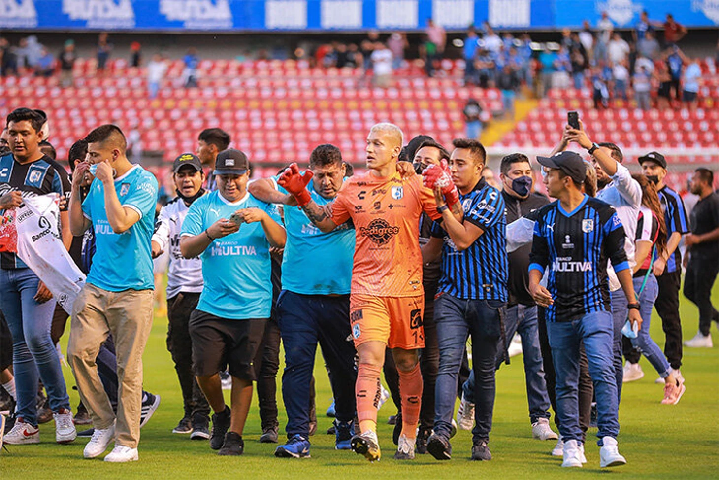 Один из фанатов «Керетаро» подлил бензина – прибежал через все поле к гостевой трибуне и спровоцировал соперников. Парня быстро остановил вратарь «Керетаро» Вашингтон Агуэрре, но погасить конфликт уже не вышло.
