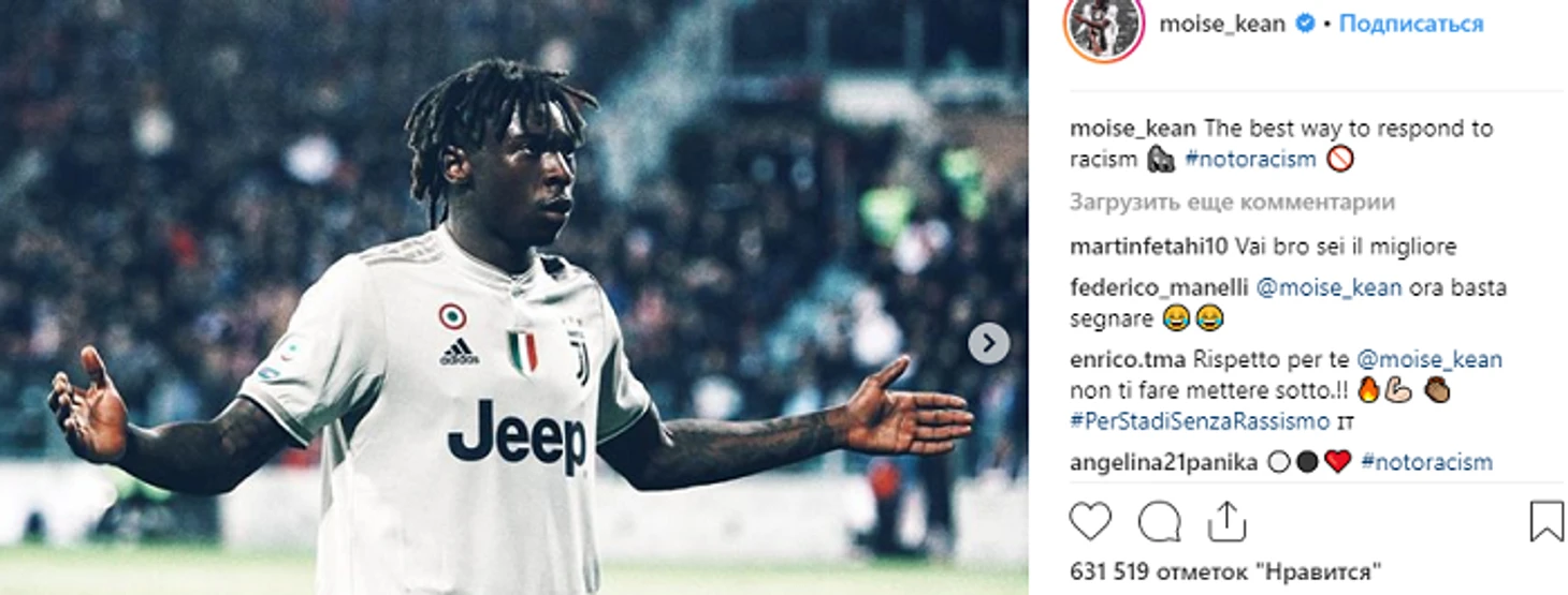 В апреле 2019-го гнев обрушивали в адрес Мойзе Кина – тогда он еще выступал за «Ювентус». Итальянца на протяжении всего матча оскорбляли на расовой почве. На 85-й минуте он забил гол после прострела Бентанкура и демонстративно развел руки перед трибуной сардинских тифози. «Лучший способ ответить на расизм», – написал потом Кин в инстаграме. Он сопроводил эти слова эмоджи-гориллой, которая вообще часто фигурирует в его инстаграме.