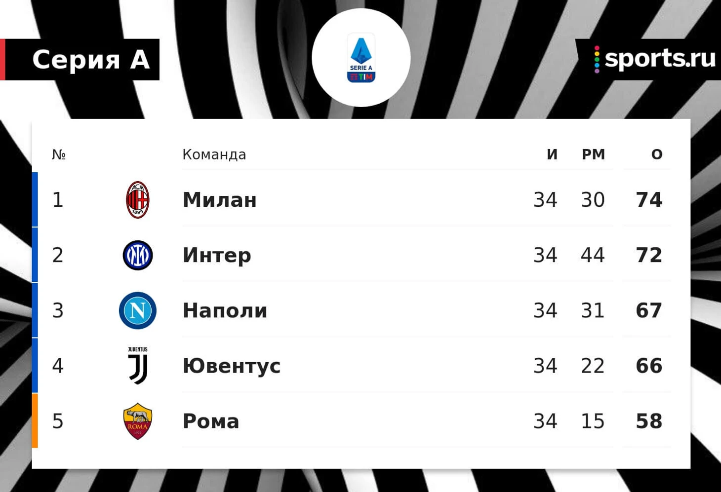 До финиша четыре тура. При равенстве очков преимущество у «Милана» за счет личных встреч (ничья и победа).