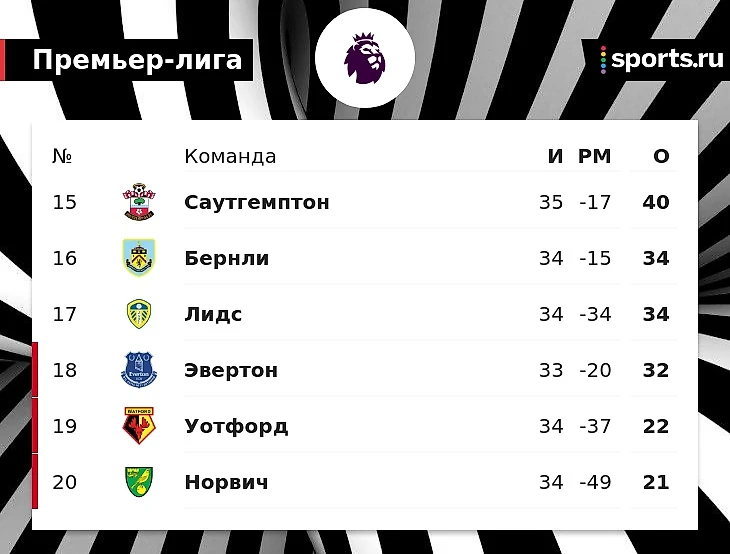 Внизу таблицы «Норвич» уже официально оформил путевку в Чемпионшип, а у «Уотфорда» остались только математически шансы остаться в АПЛ. «Эвертон», «Лидс» и «Бернли» решат, кто будет третьим вылетевшим.
