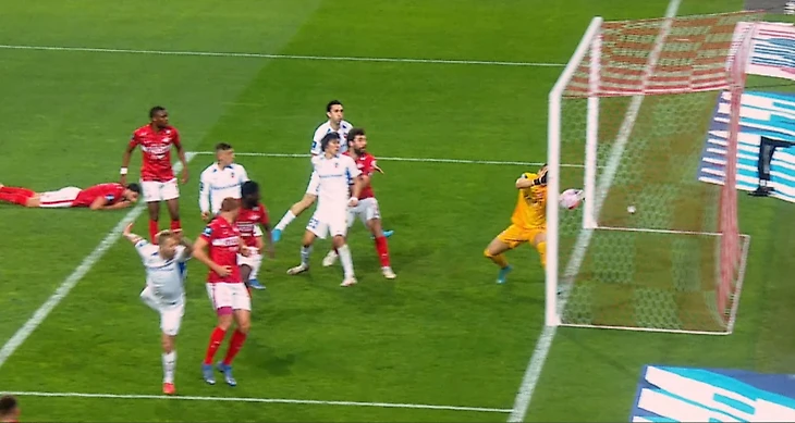 По видео толком и не понять, как на самом деле: этот скрин – с камеры, которая не совсем параллельна линии ворот, возможны искажения.