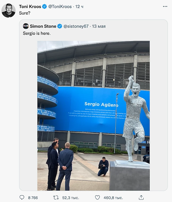 В обсуждение статуи Агуэро неожиданно ворвался полузащитник «Реала» Тони Кроос. Немец намекнул на сходство статуи с собой. Тони ретвитнул фото журналиста Саймона Стоуна с подписью «Серхио здесь».