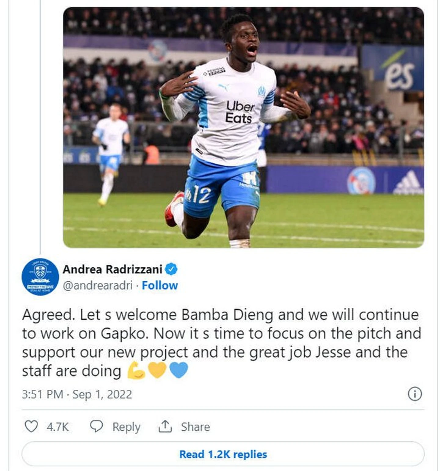 • Дьенг уже был в аэропорту Марселя и готовился лететь в Англию – «Лидс» предоставил ему частный самолет. Стороны достигли устной договоренности, с футболистом собирался лететь агент, а владелец «Лидса» Андреа Радриццани уже писал в твиттере: «Давайте поприветствуем Бамба Дьенга».