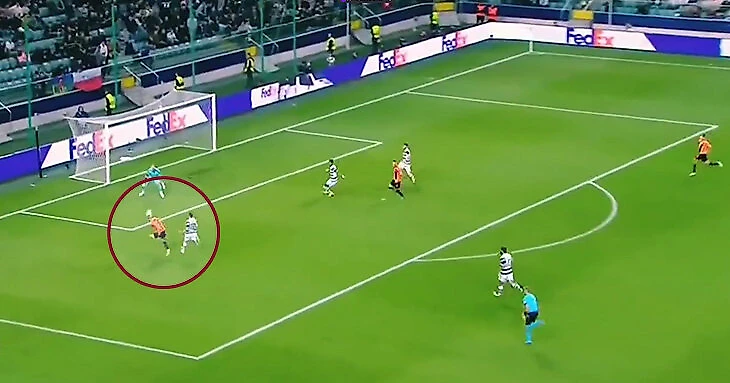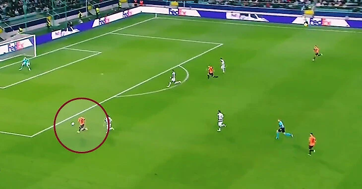 Георгий Судаков из центра поля выдал разрезающий пас на ход партнера. Мудрик включил фирменную скорость, убежал от защитника и из штрафной сильно пробил над голкипером. Очень эффектно!