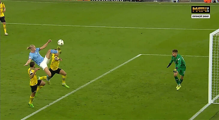 Жоау Канселу заносит ногу, чтобы внешней стороной стопы отправить в штрафную – в следующую секунду включится магия. Эрлинг находится в окружении нескольких защитников, а мяч летит на не слишком удобной высоте. Но норвежец каким-то образом бьет – очень эффектно и эффективно!