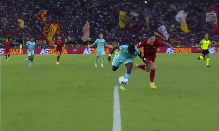 Но на повторе видно, что весь эпизод Николо грамотно держит Околи за футболку – со стороны это тяжело заметить. Из-за этого Калеб и потерял равновесие, а Дзаньоло очень артистично и умно упал – как раз утянув за собой защитника.