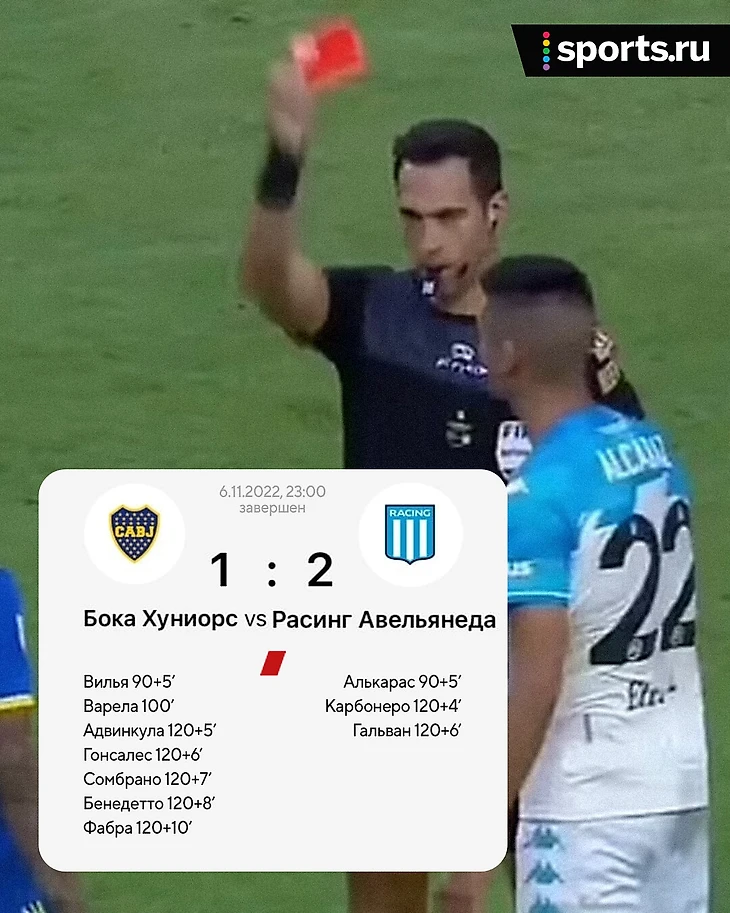На 110-й минуте Алан Варела из «Боки» удалился после опасного подката и оставил команду вдевятером – это третья красная суммарно, ведем подсчет.
