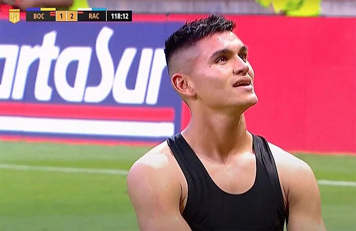 И это даже не середина спектакля. На 117-й за «Расинг» забил Карлос Алькарас (не теннисист). Он не просто снял футболку, чтобы отпраздновать с уже полученной заранее желтой, решил еще и покрасоваться прямо перед фанатами «Боки», забил как раз в ближние к ним ворота.
