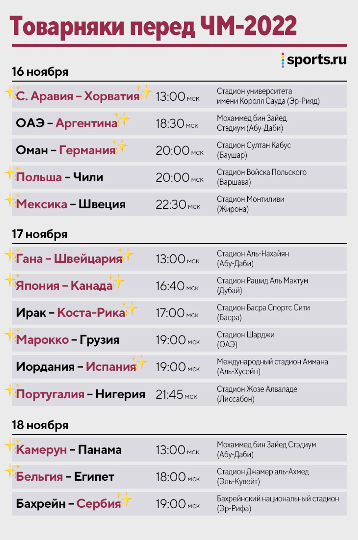 • Товарняки запланированы у 19 сборных из 32. Большинство проводят их на территории ближневосточных стран, но есть исключения. Польша играет единственный матч в Варшаве, а Португалия – в Лиссабоне.