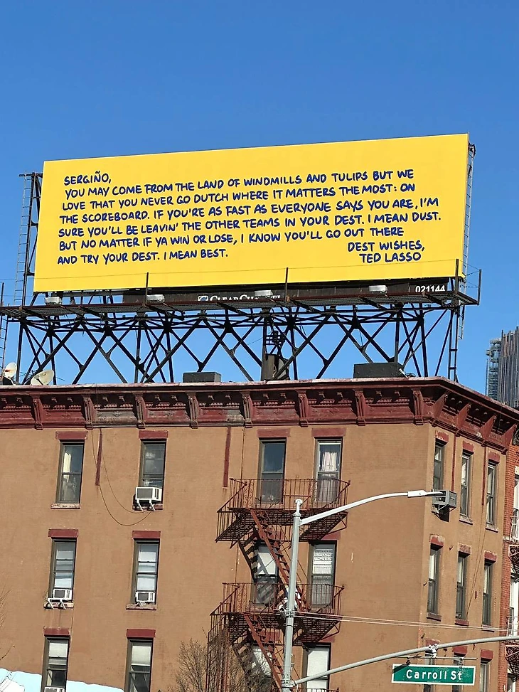 В разных уголках США появились билборды с письмами Лассо игрокам команды. Это трогательные обращения в стиле персонажа, которого играет Джейсон Судейкис. Письма разместили в важных для игроков городах и штатах. Поскольку в текстах много локальных отсылок и непереводимой игры слов, мы постарались донести суть обращений Теда.
