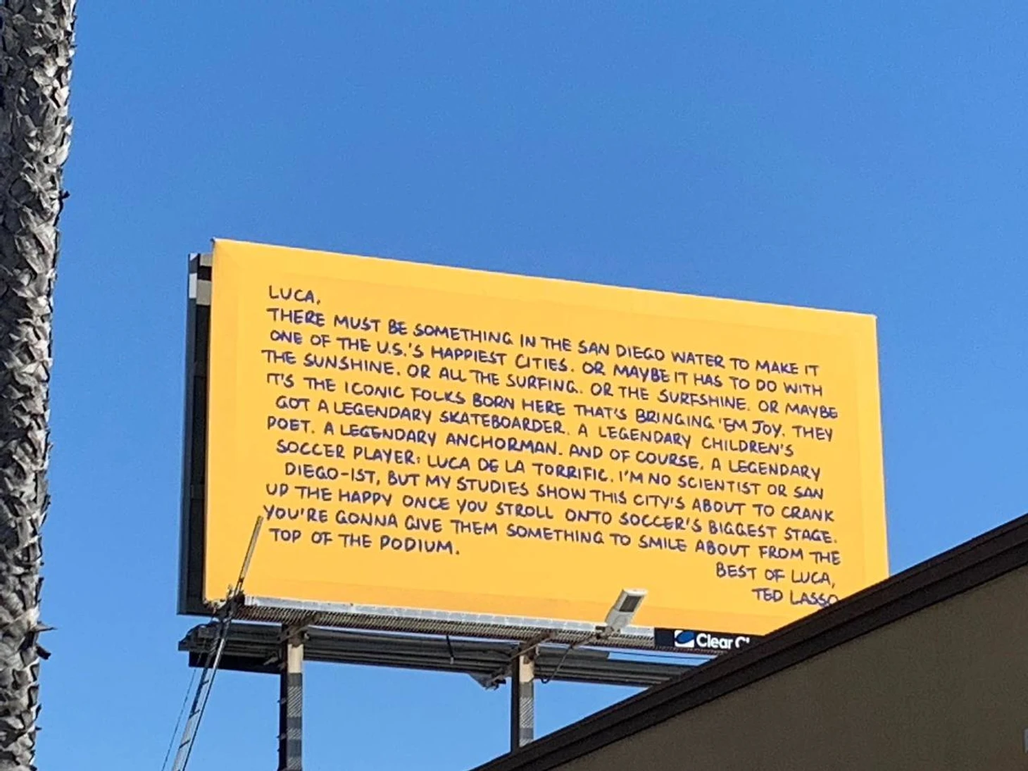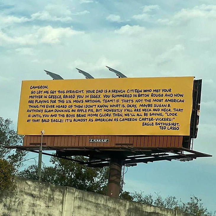 «Мэтт, горжусь тобой». Трогательные послания игрокам США от Теда Лассо – на билбордах по всей стране