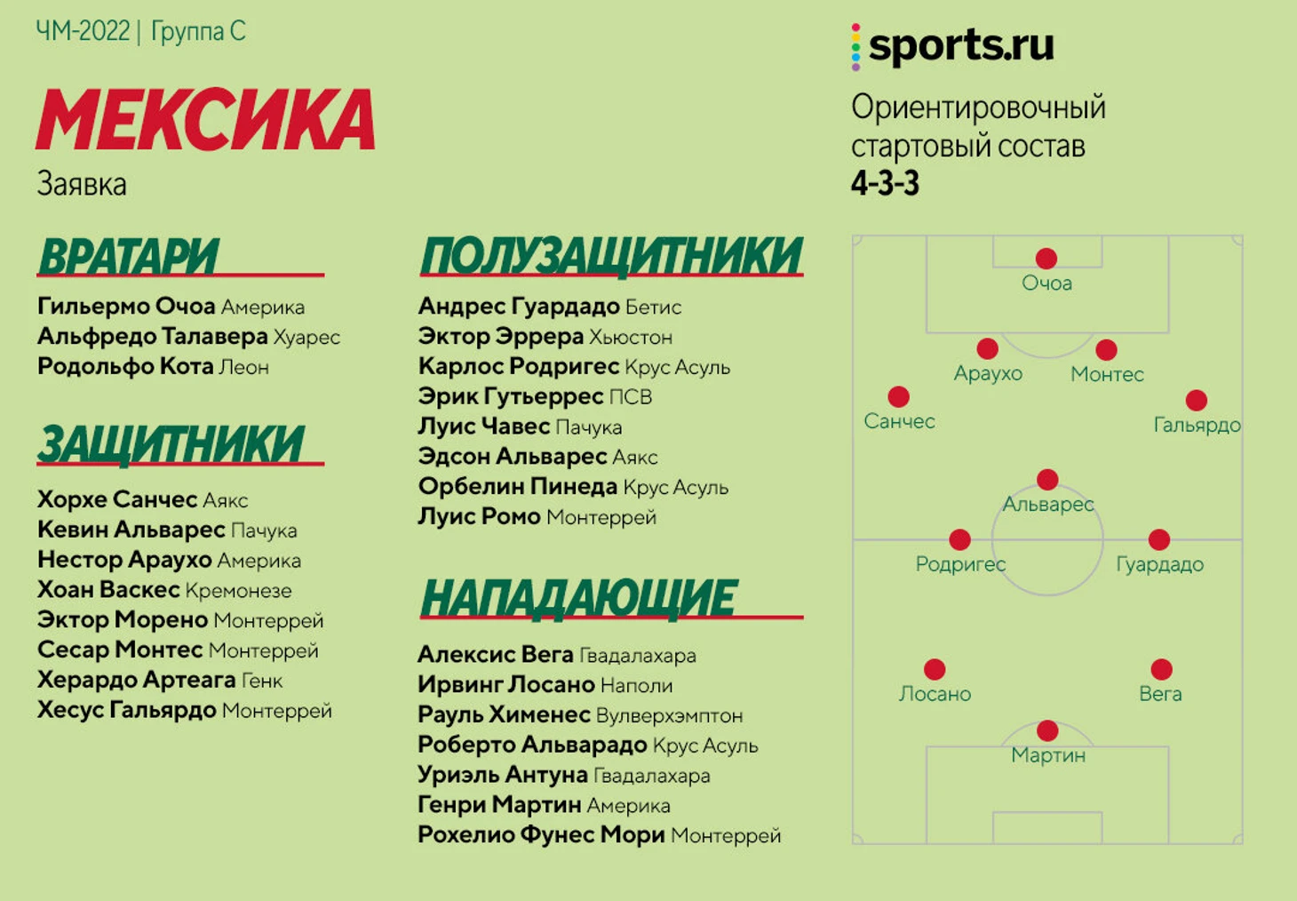 3 главные звезды. Ирвинг Лосано, Гильермо Очоа, Рауль Хименес. Лосано в этом сезоне регулярно играет за «Наполи» (19 игр, 3+3). Очоа основной в «Америке» – в 20 матчах сезона пропустил 21 гол. А вот Хименес после перелома черепа в 2020 году так и не набрал форму – лишь 297 минут за «Вулвз» в этом сезоне.