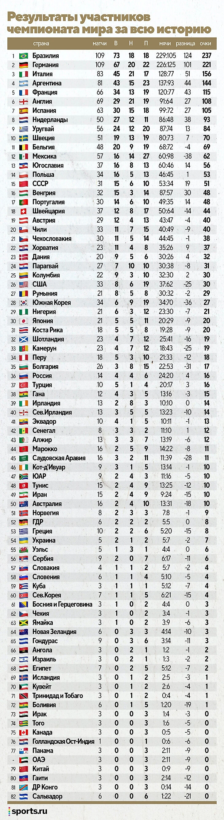 Общая таблица ЧМ за всю историю: 1-я – Бразилия, в тройке Германия и Италия, СССР – 15-й, Россия – 36-я
