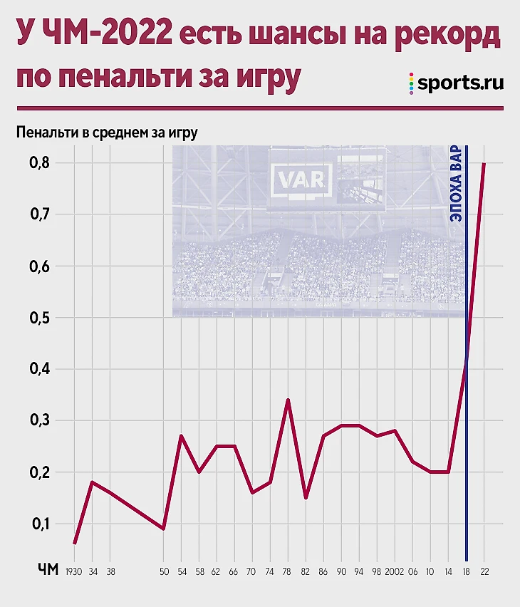 Пока на этом чемпионате ставят точки в два раза чаще, чем четыре года назад. И это при том, что ЧМ-2018 был рекордным по среднему количеству пенальти за игру. Со значительным отрывом от предыдущих чемпионатов.