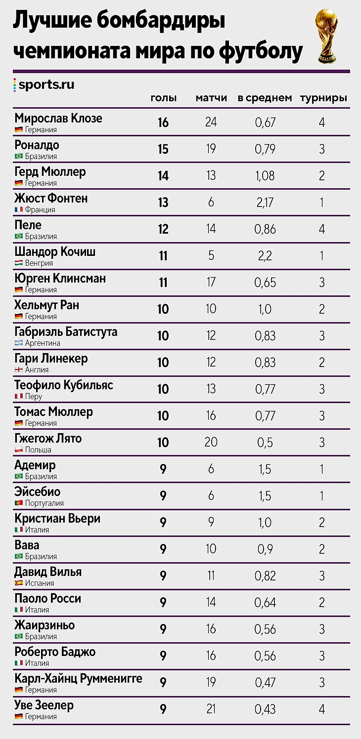 Лучшие бомбардиры ЧМ за всю историю: Мюллер догоняет Пеле, Роналду на один гол впереди Месси