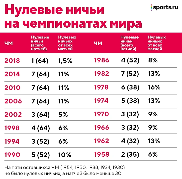 • В графике не учтены первые пять чемпионатов мира. В трех довоенных было всего 18, 17 и снова 18 матчей, в первых двух послевоенных – 22 и 26. Все они обошлись без 0:0. Мы взяли в расчет все турниры, начиная с ЧМ-1958: нулевые ничьи там встречались хотя бы раз, а матчей было сыграно больше 30.